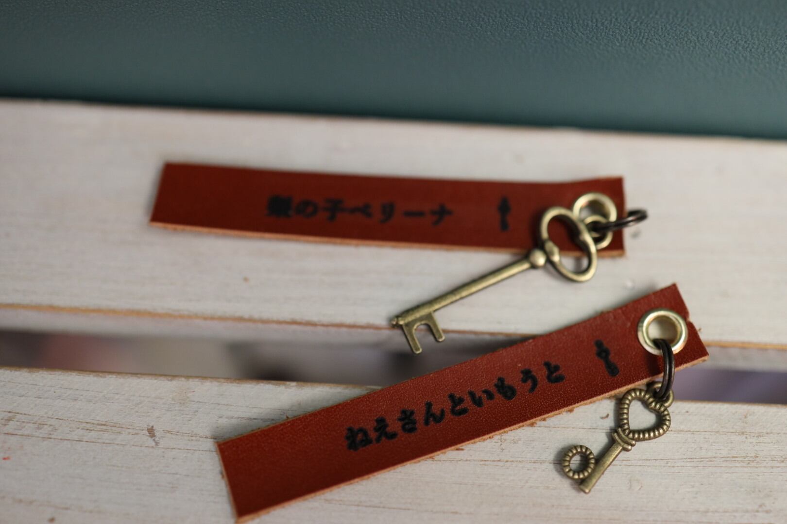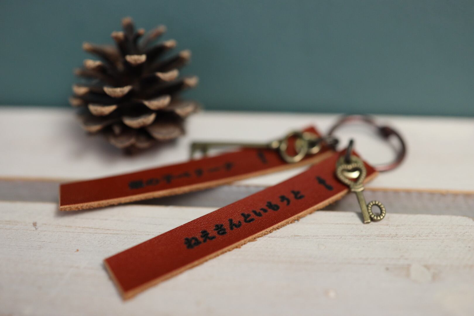 革のタグに、ご購入頂く絵本の題名を焼き付けて、キーホルダーチャームに致します。